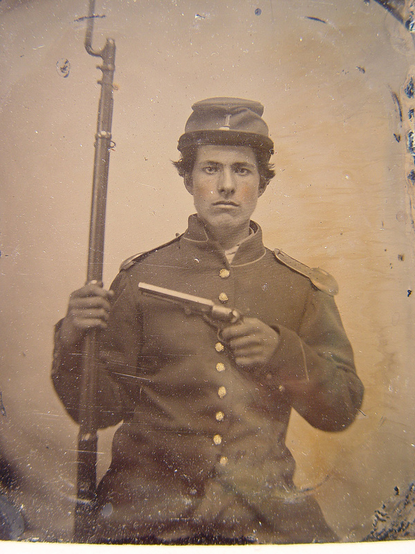 Unidentified young soldier in Union uniform with shoulder scales and forage cap with Company I insignia holding revolver and bayoneted musket