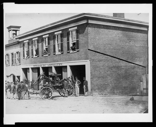 Union soldiers pull a fire engine from a garage designated Petersburg artillery
