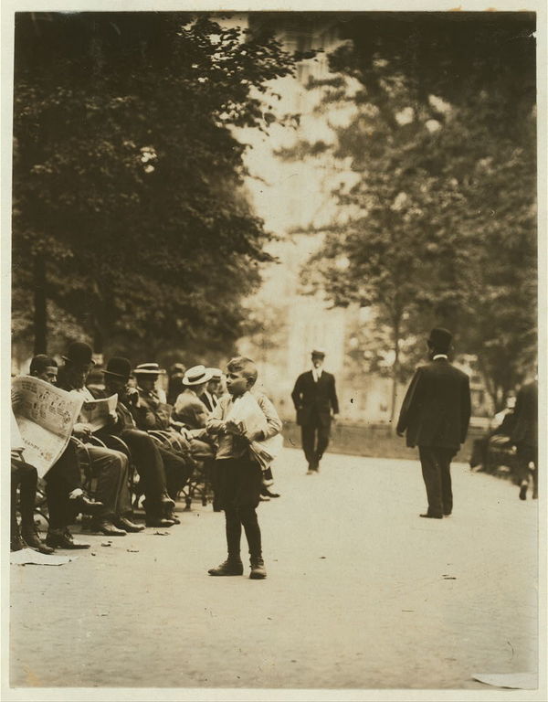 Boy collecting discarded papers in Union Square. He sells them to store-keepers. Location: New York, New York (State)
