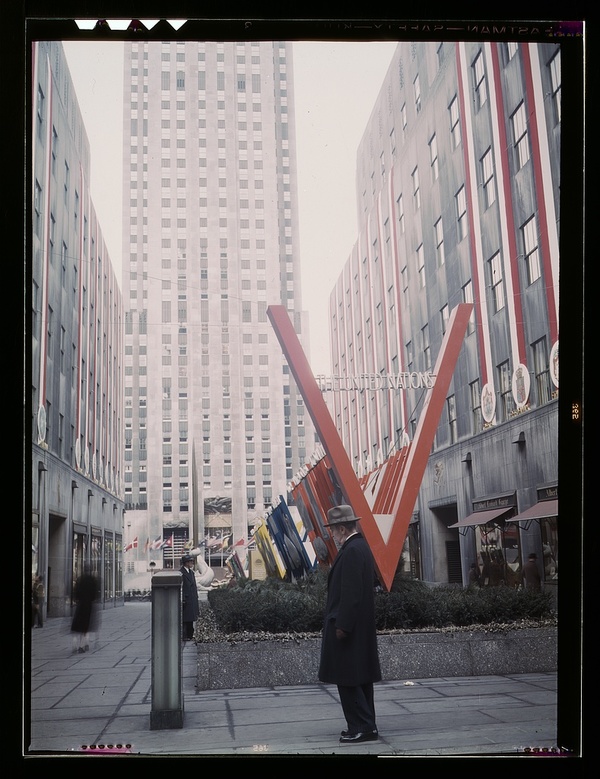 United Nations exhibit by OWI in Rockefeller Plaza, New York, N.Y. View of entrance from 5th Avenue