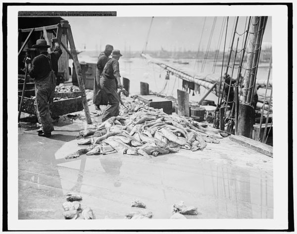 Handling a cargo from the fishing banks, Gloucester, Mass.