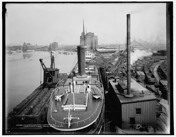 Unloading ore and loading fuel, Lackawanna ore docks, Buffalo, N.Y.