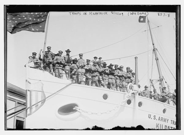 U.S. Army troops on trasport "Kilpatrick" performing war games