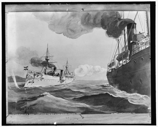U.S.S. McCulloch firing a shot across the bow of the German cruiser Irene