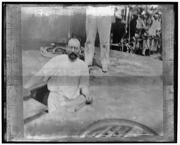 U.S.S. Oregon, Lieut. Elerle, in charge of 13-inch turret, watching the Cristobal Colon, Battle of Santiago
