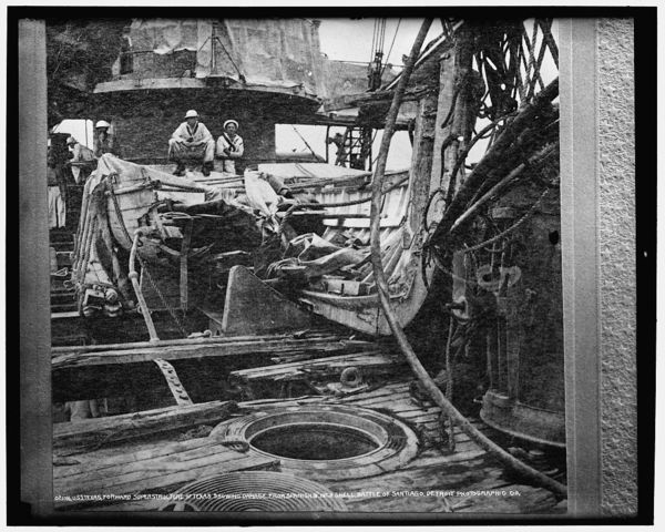 U.S.S. Texas, forward superstructure showing damage from Spanish 9-inch shell, Battle of Santiago