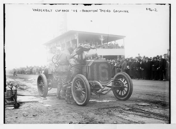 Vanderbilt Cup Auto Race, Robertson pouring gas into car tank, on racetrack