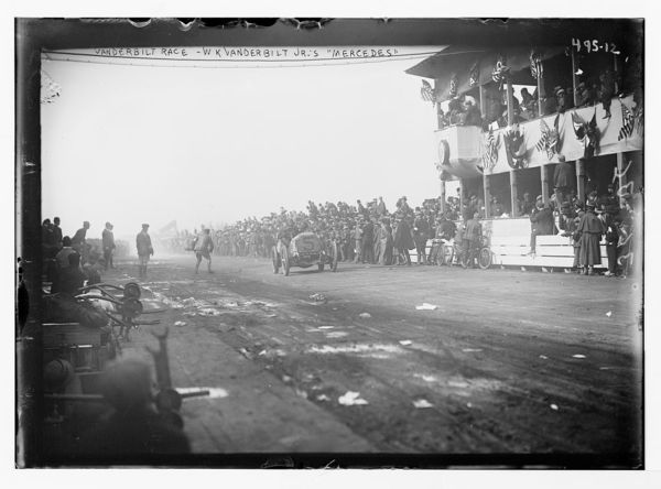 Vanderbilt Cup Auto Race, W.K. Vanderbilt, Jr.'s "Mercedes" on track in front of grandstand