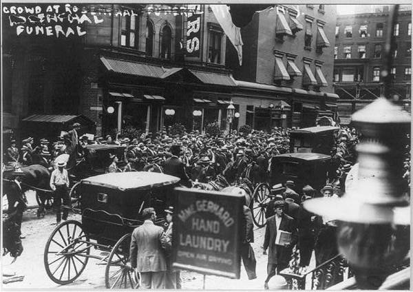 View of crowd watching the funeral of gambler Herman Rosenthal, July 1912, N.Y. City