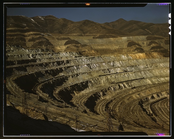 Open-pit workings of the Utah Copper Company, Bingham Canyon, Utah. This is the Carr Fork side from which the company obtains huge amounts of ore. The Carr Fork bridge and main shops appear in the foreground