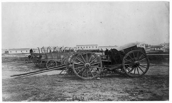 Wagons with caisson in foreground, probably at a Civil War military camp