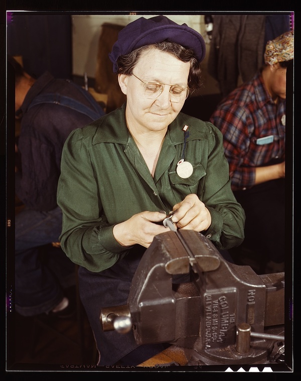 One of the girls of Vilter Manufacturing Co. filing small gun parts, Milwaukee, Wisc. One brother in Coast Guard, one going to Army.