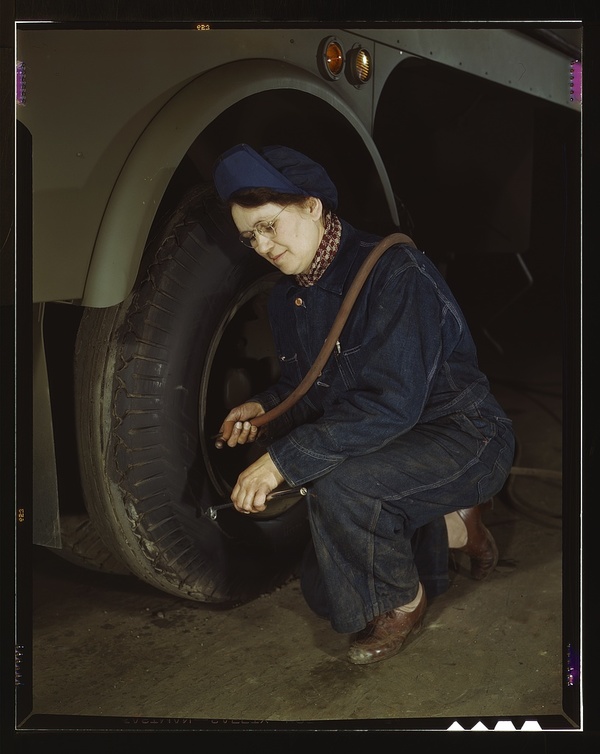 War production workers at the Heil Company making gasoline trailer tanks for the U.S. Army Air Corps., Milwaukee, Wisconsin. Mrs. Angeline Kwint, age 45, an ex-housewife, checking the tires of trailers. Her husband and son are in the U.S. Army