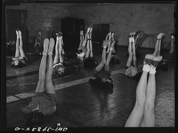 Washington, D.C. A physical education class doing mass exercises in the gymnasium at Woodrow Wilson High School