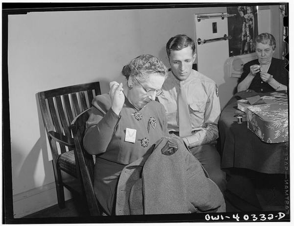 Washington, D.C. A volunteer at the United Nations service center sewing insignia and newly-acquired chevrons on the overcoat of a paratrooper