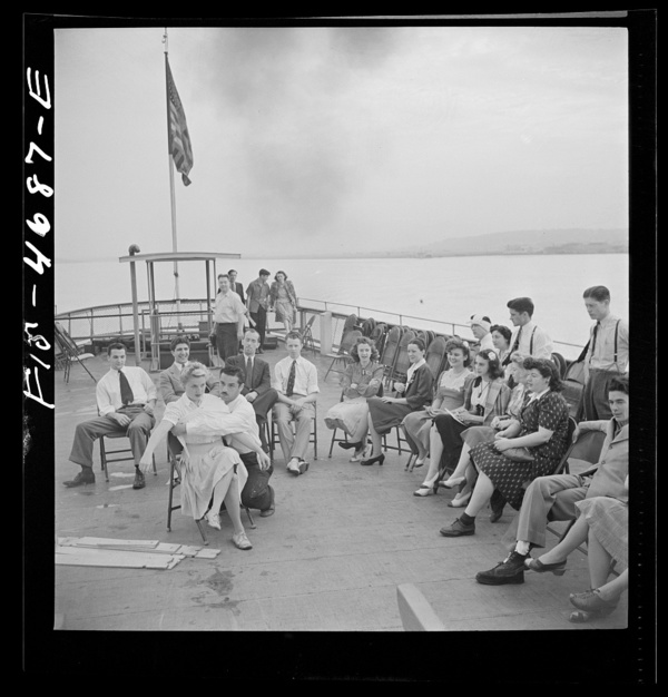 Washington, D.C. Bandaging an "injured" arm as part of a course in first aid, aboard a Potomac River boat