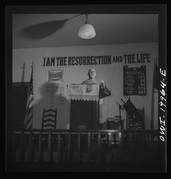 Washington, D.C. Brother Edwin Foote preaching a sermon at the First Wesleyan Methodist Church. He wears sackcloth to reprimand the congregation for not attending a revival meeting held the preceding week