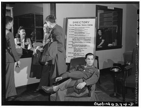 Washington, D.C. Soldiers waiting between trains playing cards in the game room at the United Nations service center