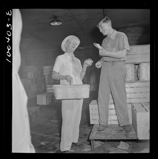 Washington, D.C. District grocery store warehouse on 4th street S.W. Store owner kidding with the order foreman. There are 200 odd member stores in the District of Columbia