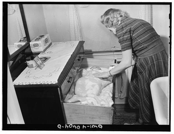Washington, D.C. Lynn Massman, wife of a second class petty officer who is studying in Washington, experimenting with a new hairdo while her infant son has his afternoon nap
