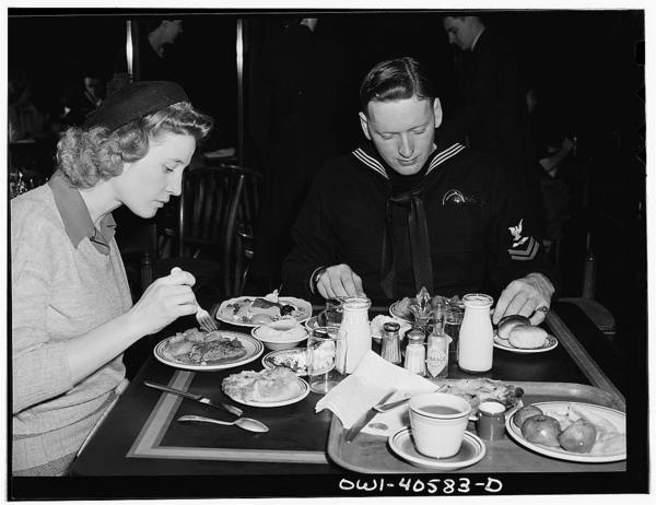 Washington, D.C. Hugh and Lynn Massman eating lunch at a cafeteria after a day of sightseeing. Their eight-weeks-old son is being taken care of at the United Nations service center nursery