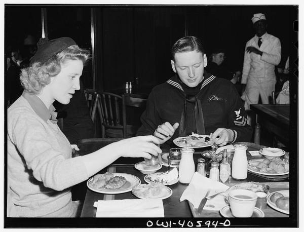 Washington, D.C. Hugh and Lynn Massman eating lunch at a cafeteria after a day of sightseeing. Their eight-weeks-old son is being taken care of at the United Nations Service Center nursery