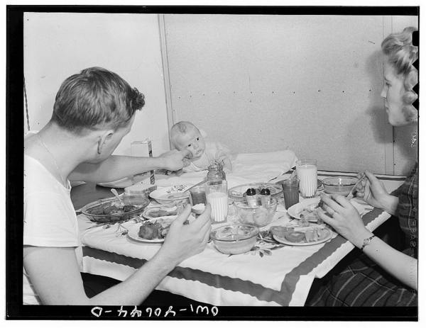 Washington, D.C. Lynn Massman, wife of a student at the Naval Air Station, eating breakfast while her eight-weeks-old son takes a nap