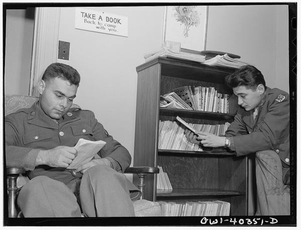 Washington, D.C. In the library at the United Nations service center. Boys are urged to take books back to camp with them