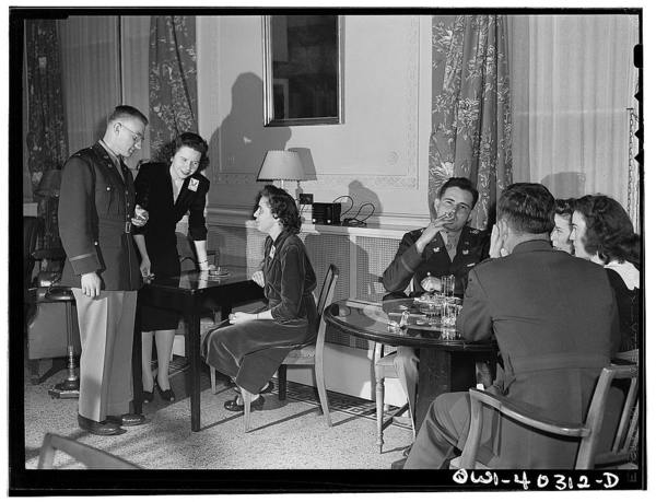 Washington, D.C. In the officers' lounge at the United Nations service center, a hostess introduces a young officer to one of the volunteer hostesses