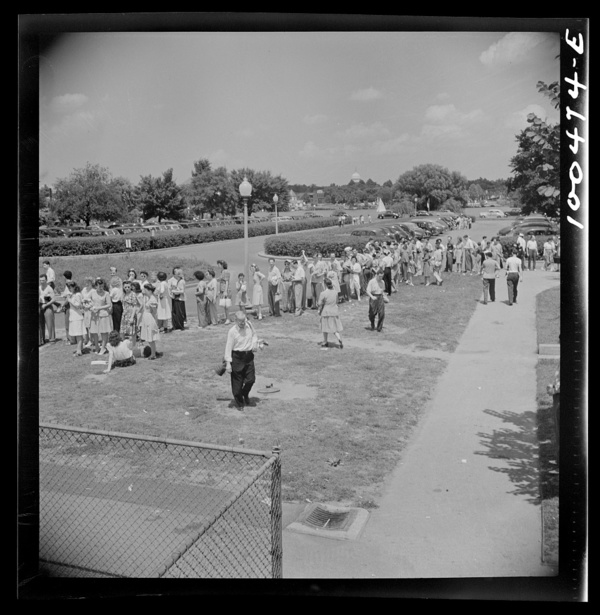 Washington, D.C. Line of prospective swimmers, awaiting their turn at the municipal swimming pool on Sunday. The Capitol is in the background