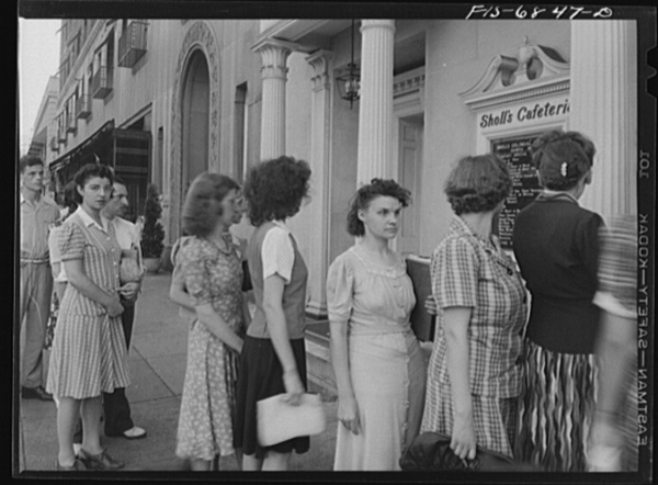 Washington, D.C. Line outside Scholl's cafeteria on Connecticut Avenue, at six p.m. Over 100 people stand in line and are served at the rate of one every minute
