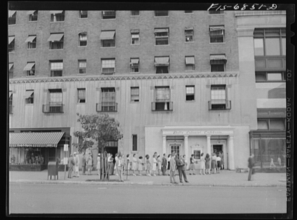 Washington, D.C. Line outside Scholl's cafeteria on Connecticut Avenue, at six p.m. Over 100 people stand in line and are served at the rate of one every minute
