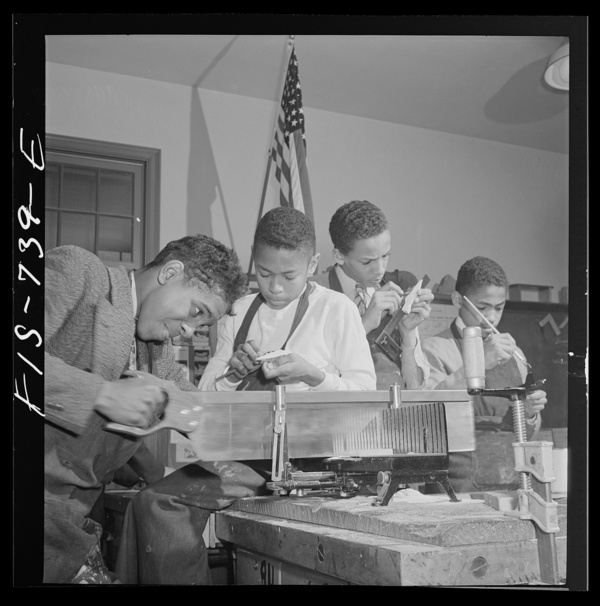 Washington, D.C. Using an electric drill to make model airplanes for the U.S. Navy at the Armstrong Technical High School