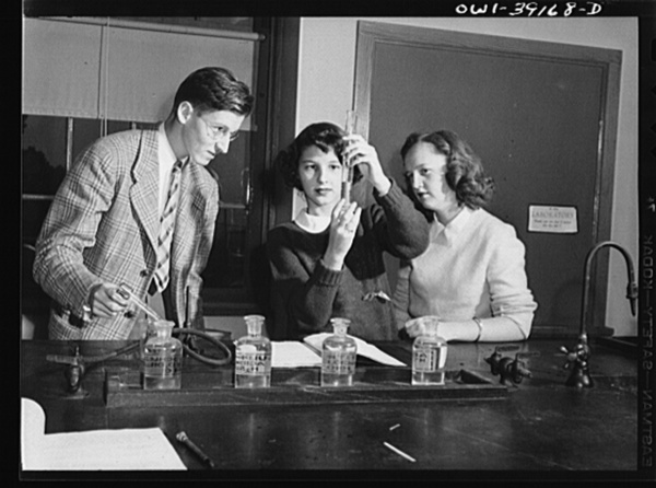 Washington, D.C. Members of a chemistry class at work in the laboratory at Woodrow Wilson High School