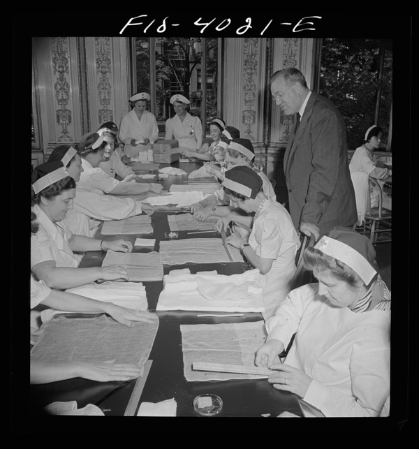 Washington, D.C. Mr. Lund, who is head of the District Red Cross, dropped in at the District chapter house, where a Norwegian unit of the Red Cross was wrapping bandages