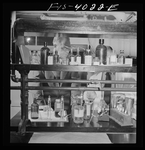 Washington, D.C. Mr. Lund, who is head of the District Red Cross, watching the testing of blood plasma at the District blood donor center