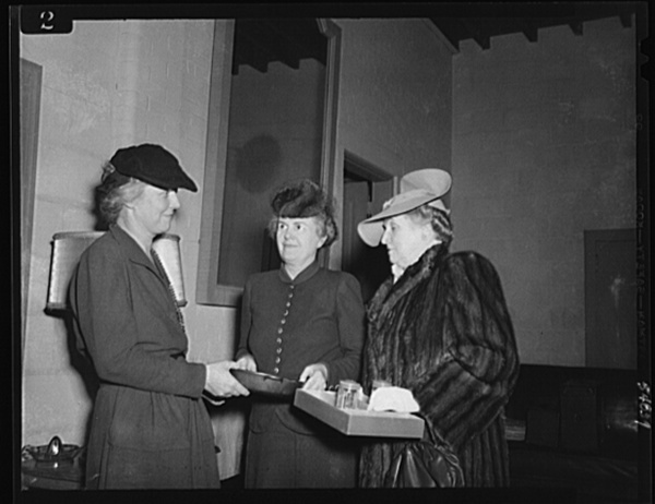 Washington, D.C. Mrs. James M. Landis, Mrs. Henry Wallace, and Mrs. Jesse Jones admiring gifts at the kitchen shower at the Walsh Club for war workers