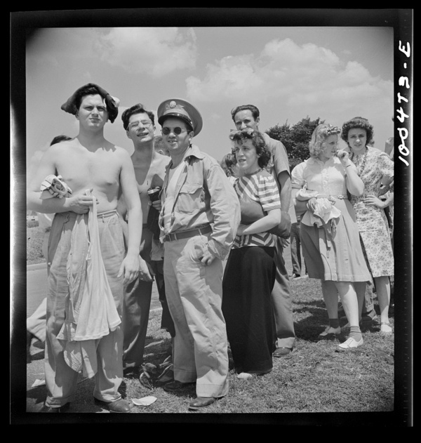 Washington, D.C. Line of prospective swimmers, awaiting their turn at the municipal swimming pool on Sunday. The Capitol is in the background