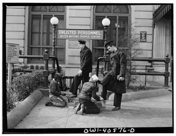 Washington, D.C. Servicemen using the laundry facilities in the sub-basement of the United Nations service center. It is not necessary to engage a hotel room in order to use these accomodations