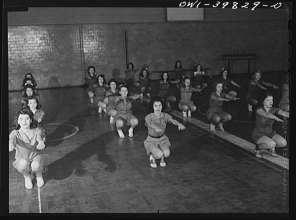 Washington, D.C. Physical education class doing mass exercises in the gymnasium at Woodrow Wilson High School