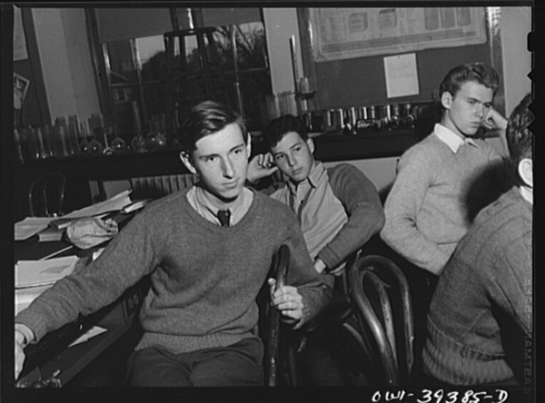 Washington, D.C. Chemistry students making notes in the apparatus used for an experiment at Woodrow Wilson High School