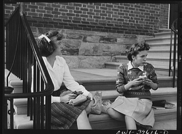 Washington, D.C. Sally Dessez eating lunch with a friend. They bring sandwiches from home and, weather permitting, eat on the steps of the Woodrow Wilson High School