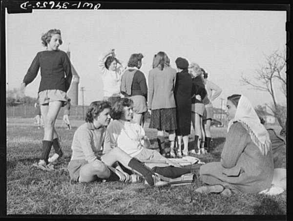 Washington, D.C. Sally Dessez (seated on the left) a student at Woodrow Wilson High School, waiting to get into a hockey game