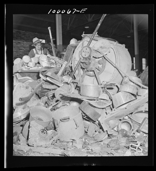 Washington, D.C. Salvage drive, Victory Program. Miscellaneous metal scrap in warehouse of District wholesale junk company. Man in background is "cleaning" metal objects