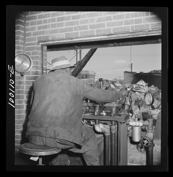 Washington, D.C. Scrap salvage campaign, Victory Program. Motor which runs hydraulic press for metal in a wholesale junkyard. Outside, blocks of metal can be seen