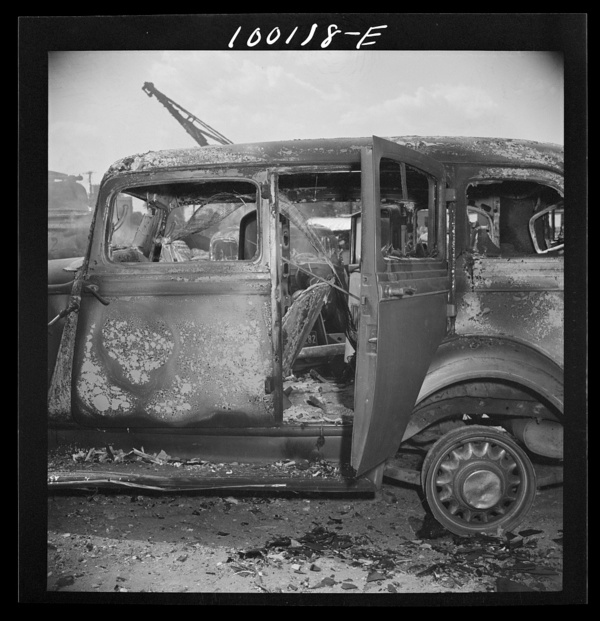 Washington, D.C. Scrap salvage campaign, Victory Program. Metal skelton of an old car which has been burned in order to get rid of useless materials after being stripped of saleable parts at the wholesale junkyard
