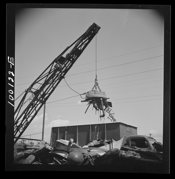 Washington, D.C. Scrap salvage campaign, Victory Program. Electro-magnet loads metal scrap onto freight car in wholesale junkyard