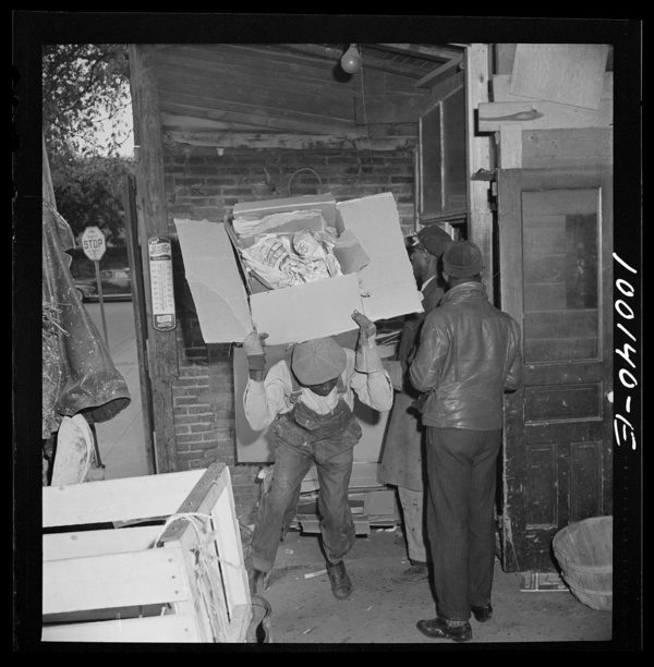 Washington, D.C. Scrap salvage campaign, Victory Program. Loading scrap paper into a hydraulic press at a retail junk dealer's yard