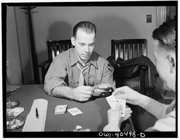 Washington, D.C. Soldiers waiting between trains enjoy a card game at the United Nations service center
