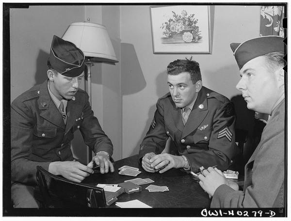 Washington, D.C. Soldiers waiting between trains playing cards in the game room at the United Nations service center